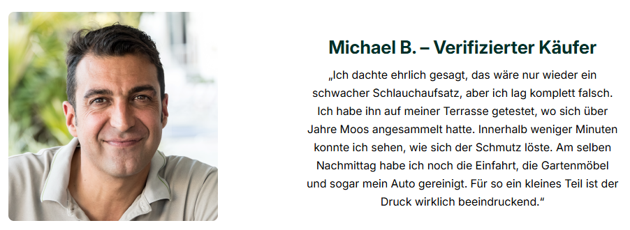 „Meine Einfahrt war voller Moos, die Terrasse grün vor Algen. Ein Hochdruckreiniger musste her”, erinnert sich Berger. „Aber als ich die Preise gesehen habe – 400, 500, teilweise über 600 Euro – da hab ich mich gefragt: Geht das nicht einfacher?”